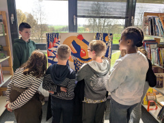 Puis c’était au tour des élèves de 6e de faire visiter l’exposition aux élèves de CM1-CM2. Lundi 31 mars, les 6E ont accueilli les élèves de l’école Jules Verne de Ploërmel, et mardi 1er avril, les élèves de 6B ont accueilli les élèves de l’école de Taupont. En petits groupes, les élèves de CM effectuaient une rotation toutes les 5 min pour découvrir ainsi l’ensemble des œuvres. Les CM ont aussi apporté leurs productions pour les présenter aux 6e, le thème commun étant la Métamorphose.