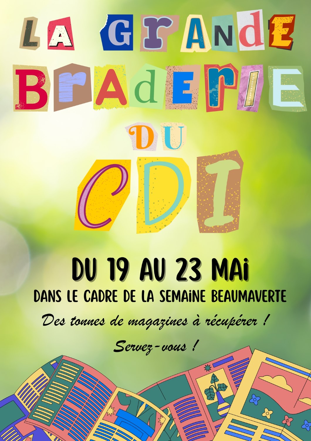CDI : Grande braderie du CDI (des tonnes de magazines à récupérer !), sélection d’ouvrages sur les animaux en voie de disparition, coloriage XXL sur le thème de la nature à réaliser tous ensemble, concours de dessin sur le thème : Animal.