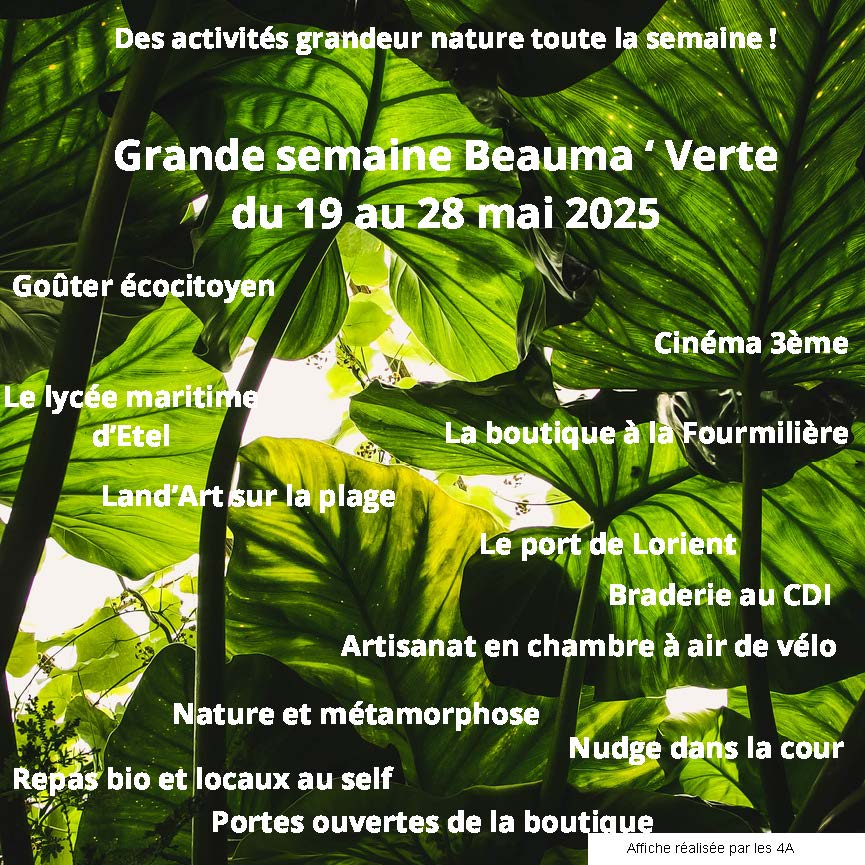 Du 19 au 28 mai, le collège Beaumanoir se met au vert ! Pendant cette grande semaine Beaumaverte, les élèves vont être sensibilisés à l’écologie et au développement durable plus largement au travers de nombreuses actions !