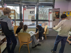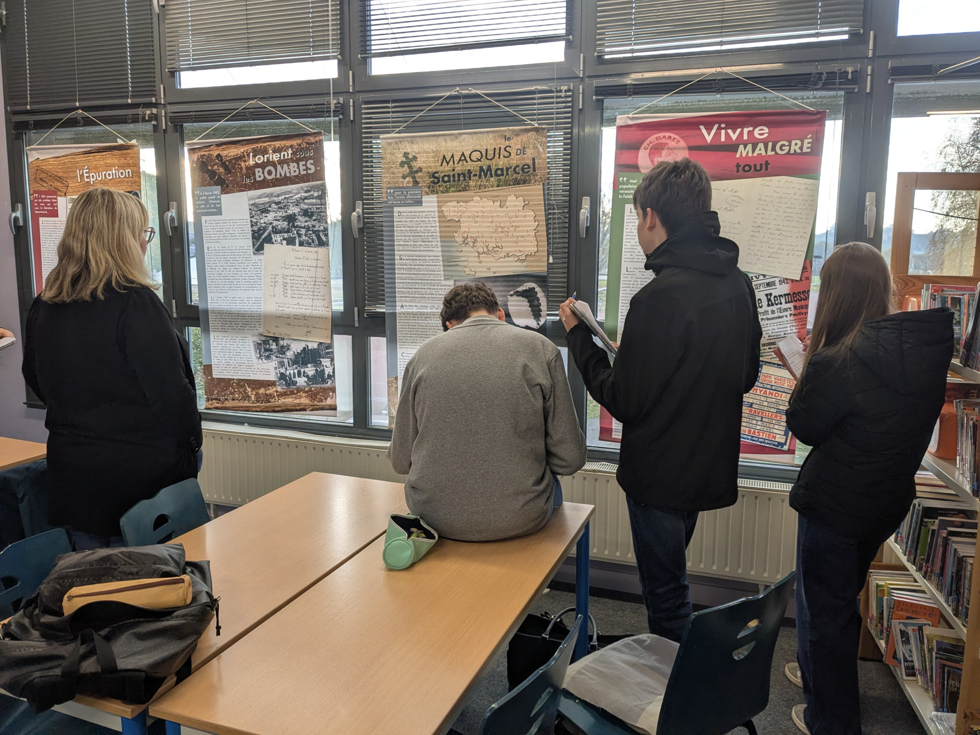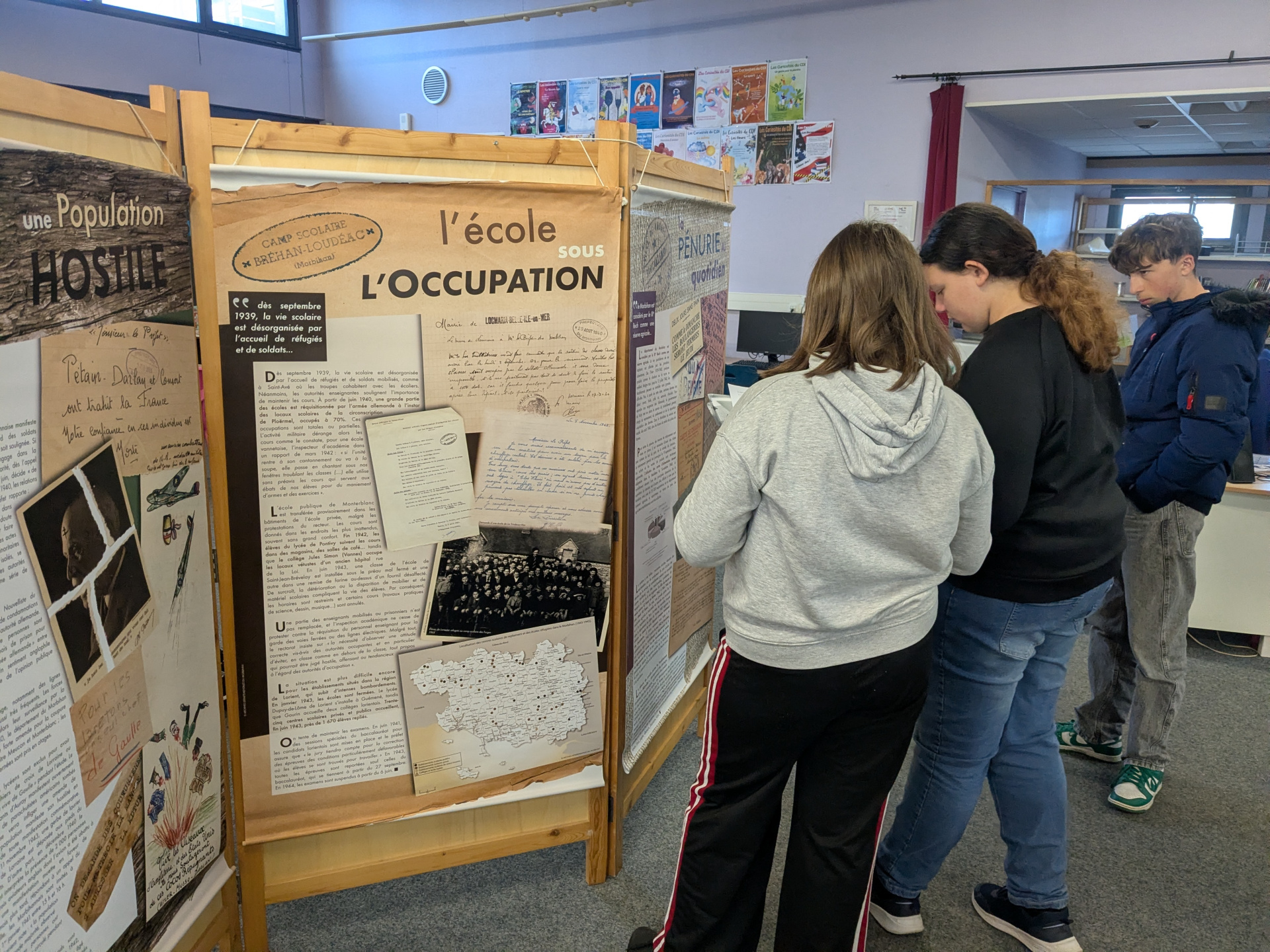 Au mois de novembre, l’exposition « Le Morbihan en guerre 1939-1945 » est installée au CDI. Les élèves de 3e en ont fait la visite à l’aide d’un questionnaire, dans le cadre de leur cours d’Histoire. En septembre déjà, les archives départementales du Morbihan prêtaient au collège l’exposition sur la première guerre. Ainsi les élèves ont pu avoir un aperçu des heures les plus sombres de leur département au travers de ces deux conflits .