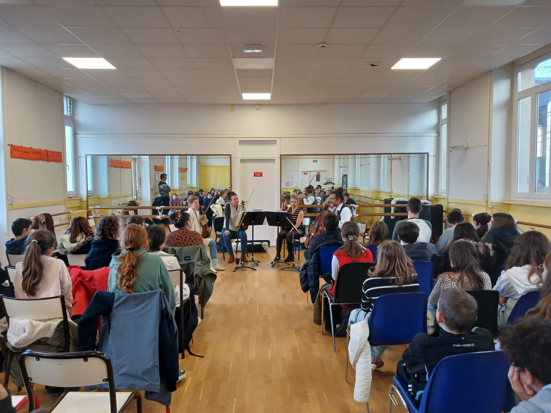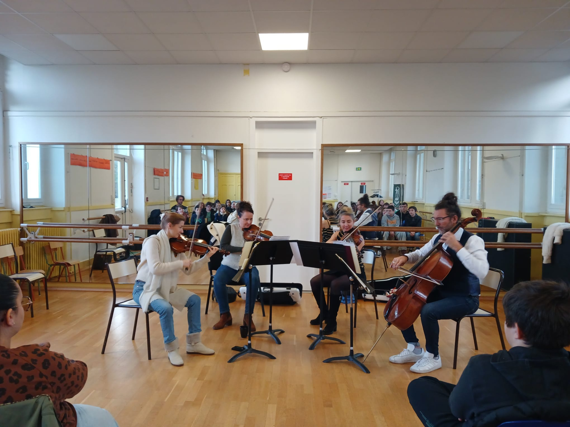 Vendredi 19 décembre, les élèves suivant l’option OAE (Orchestre à l’école) ont eu la chance de rencontrer le Quatuor Psophos, à l’école de musique de Ploërmel. Ecoute, échanges et bonnes notes étaient bien sûr au rendez-vous de cette rencontre musicale !