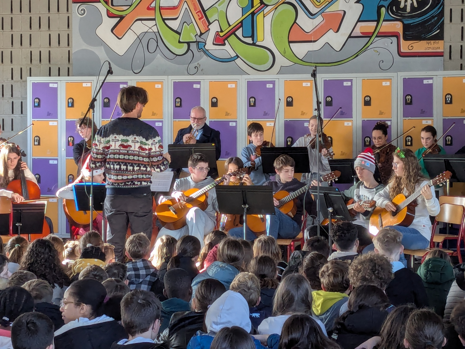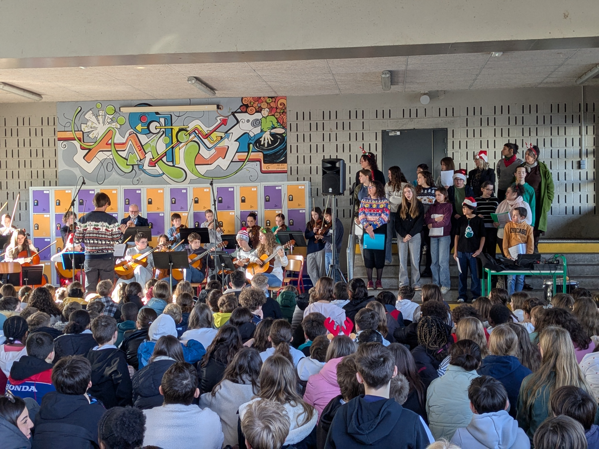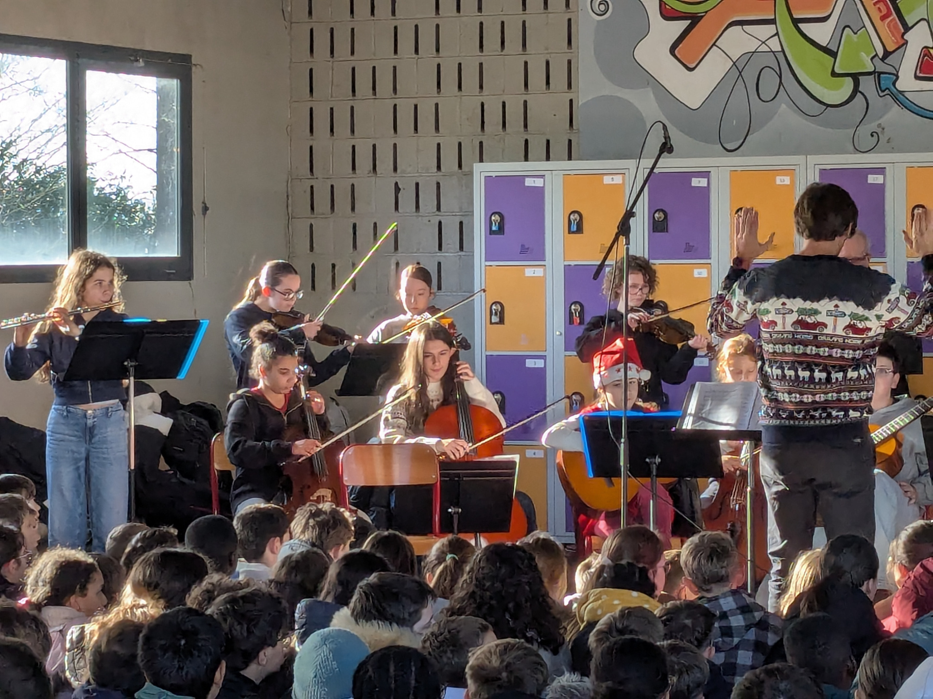 Afin de clôturer cette période de façon chaleureuse et musicale, les élèves de la classe orchestre et la chorale (composée d’élèves mais aussi de quelques enseignants et parents), ont interprété des morceaux appris depuis la rentrée et des airs bien connus pour fêter Noël !