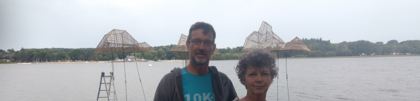 Deux artistes d’Etangs d’Art, biennale de sculpture contemporaine sur l’eau, Fiona Paterson et Jérôme Leyre dévoilent leur oeuvre en cours de création sur le Lac au Duc devant un public attentif et intéressé.